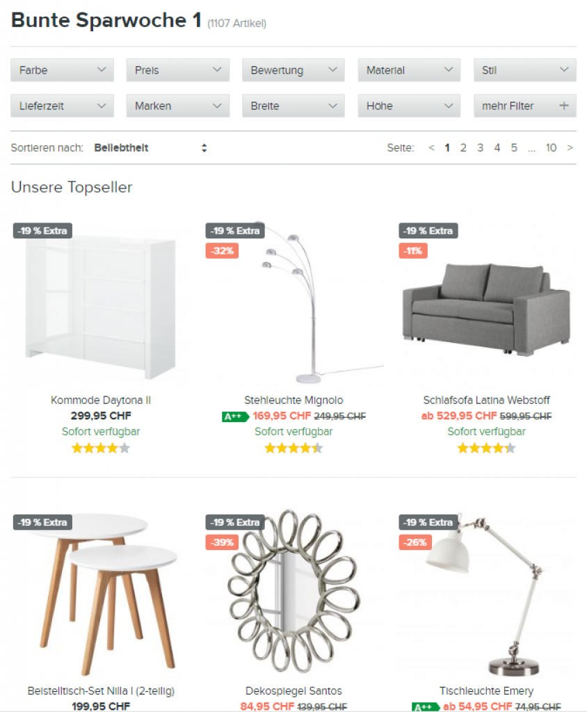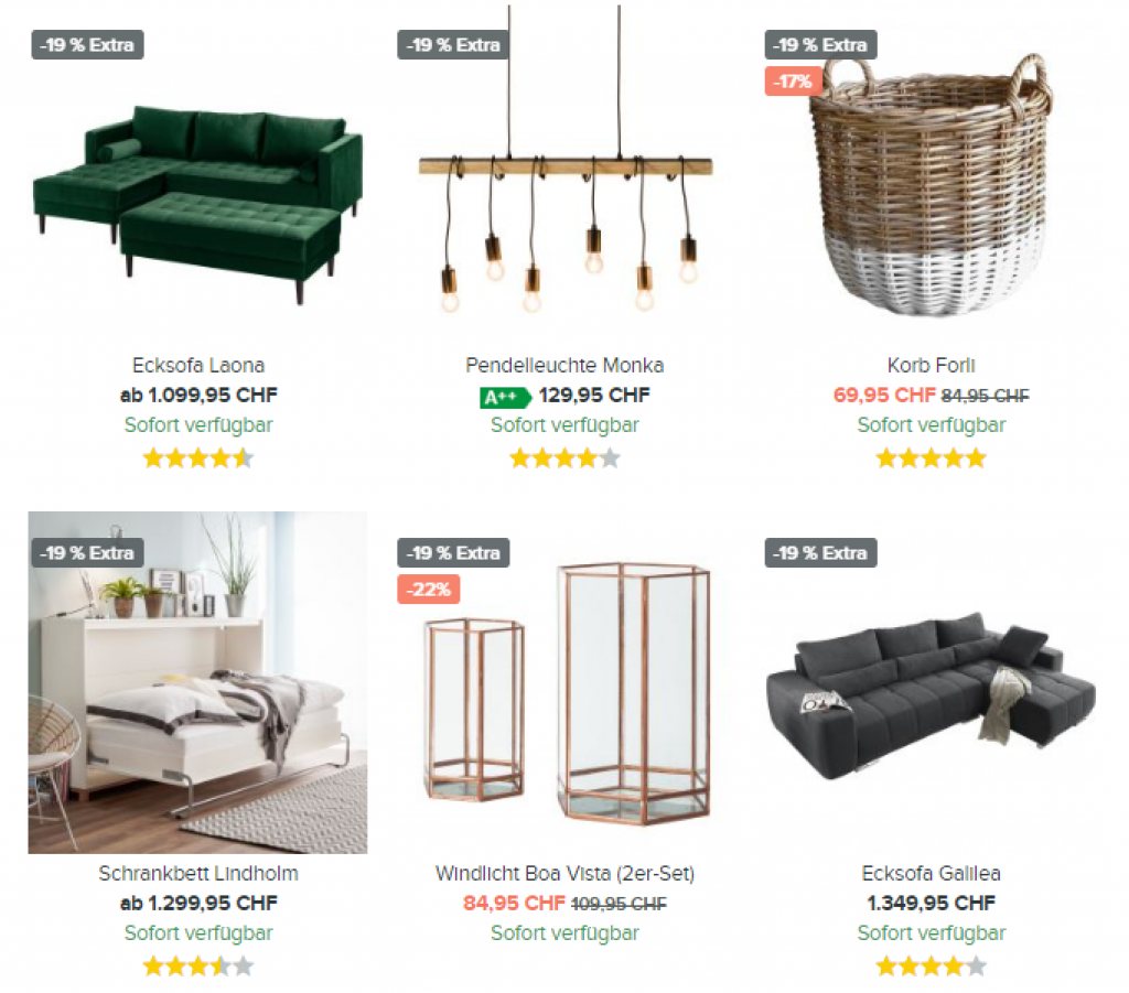 Momentan ist die Bunte-Sparwoche bei home24. Mit dem Gutscheincode BLACK-CH-19 erhält man 20% Rabatt auf alle Artikel in der Aktions-Kategorie.