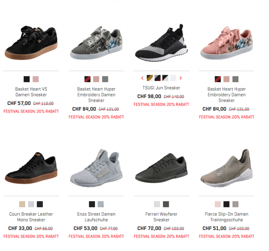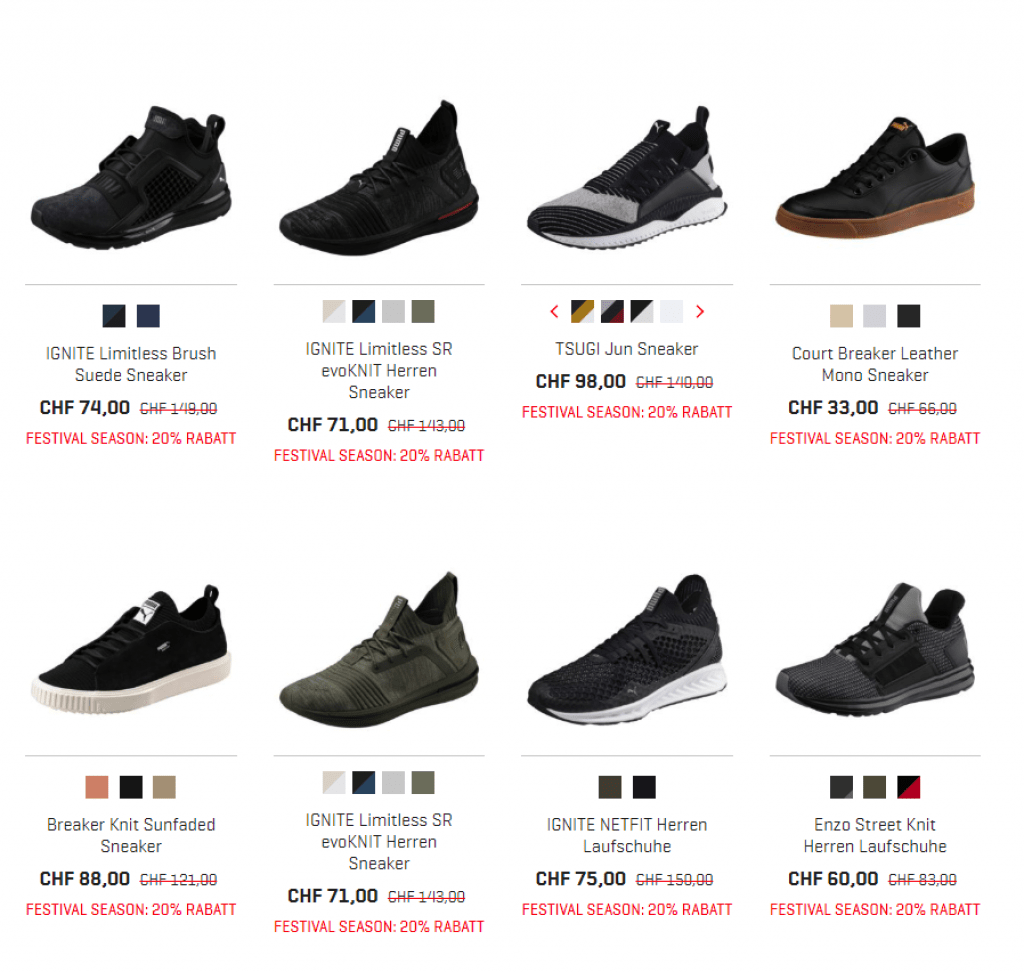 Im Puma Onlineshop erhält man noch bis am 3. Juni 20% zusätzlichen Rabatt auf alle Artikel im Sale. Die Versandkosten betragen unabhängig vom Bestellwert immer CHF 6.95. Ein Gutscheincode ist nicht notwendig, um vom Angebot zu profitieren.