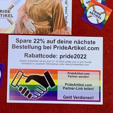 Beim Pride-Shop gibt es jetzt 22% auf alle Artikel im Versand. Den Pride Shop gibt es als Ladenlokal in Bern, dort ist der Gutschein nicht gültig, nur für Onlinebestellungen.