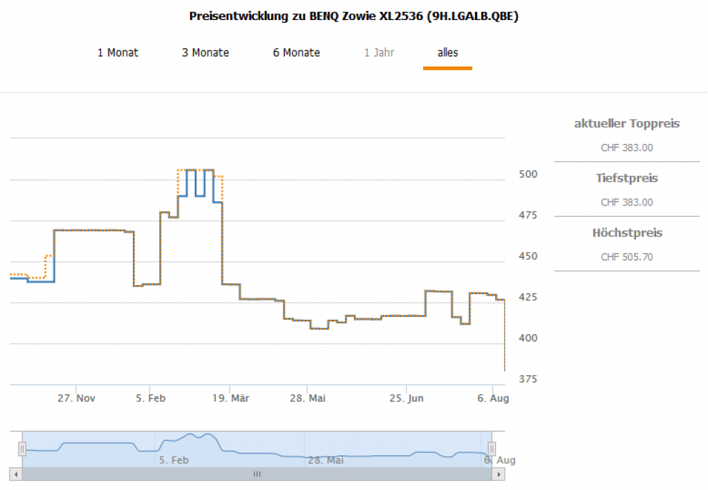 Gemäss toppreise gab es den Monitor bislang nie günstiger als für 409.- CHF, der zweitbeste Preis liegt aktuell bei 427.60 CHF.