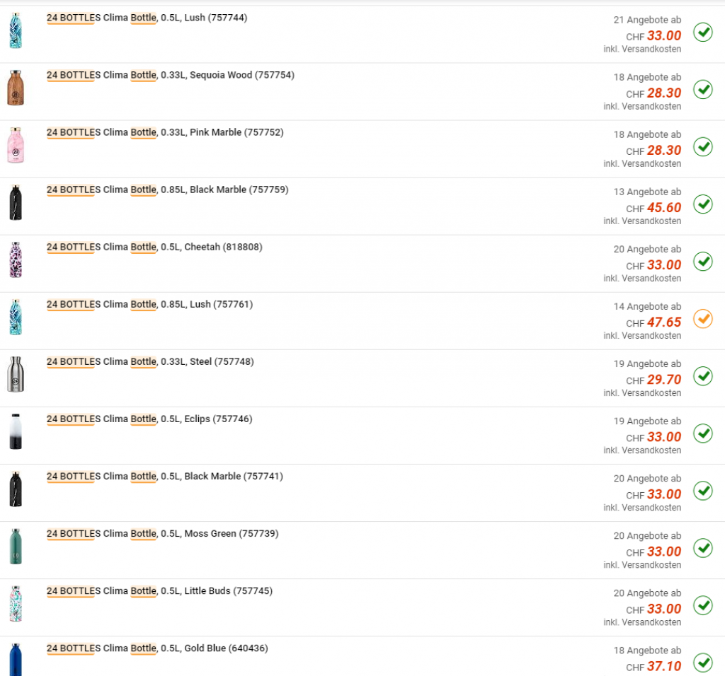 Bei Orell Füssli gibt’s gerade die beliebten 24 Bottle Thermosflaschen für CHF 19.95 Bisher habe ich die Thermosflaschen noch nicht unter 23 Franken gesehen, derzeit laut toppreise in der 500ml Version zwischen 29-35 Franken. Zusätzlich kann man sich bei Orell Füssli zum Newsletter anmelden und erhält einen Rabatt von 15% obendrauf.