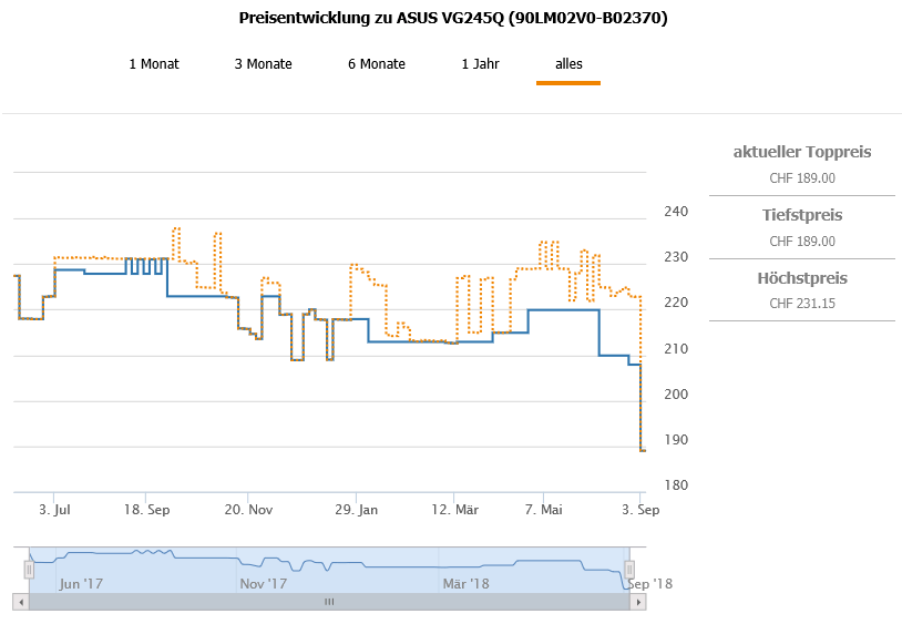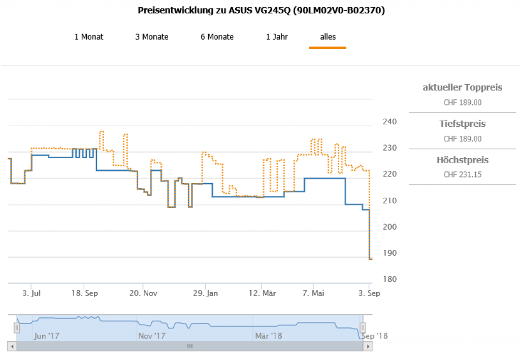 Gemäss toppreise gab es den Monitor bislang nie günstiger als für 208.90 CHF, der zweitbeste Preis liegt aktuell bei 222.80 CHF.