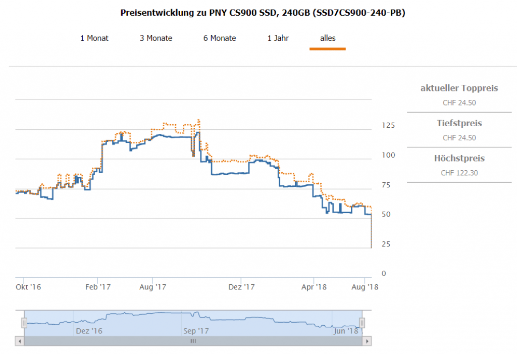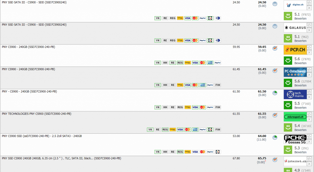 Liefertermin unbekannt, dennoch ein guter Preis. Bei digitec gibt’s eine 240GB grosse SATA3 SSD Festplatte von PNY für gerade mal 24.50. Zweitbester Preis in der Schweiz liegt bei CHF 59.95.