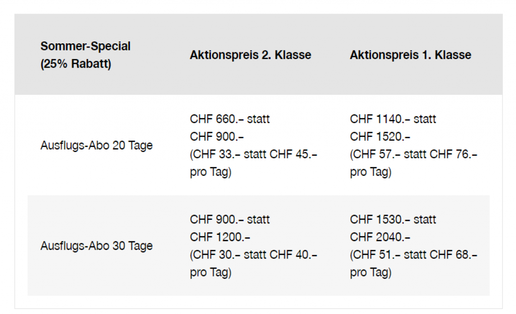 Bei der SBB gibt es bis zum 31. Juli bis zu 25% Rabatt auf das Ausflugsabo. Meines Erachtens für Gelegenheitsfahrer eine kostengünstige Alternative zur Tageskarte Gemeinde, sofern man ein Halbtax besitzt.