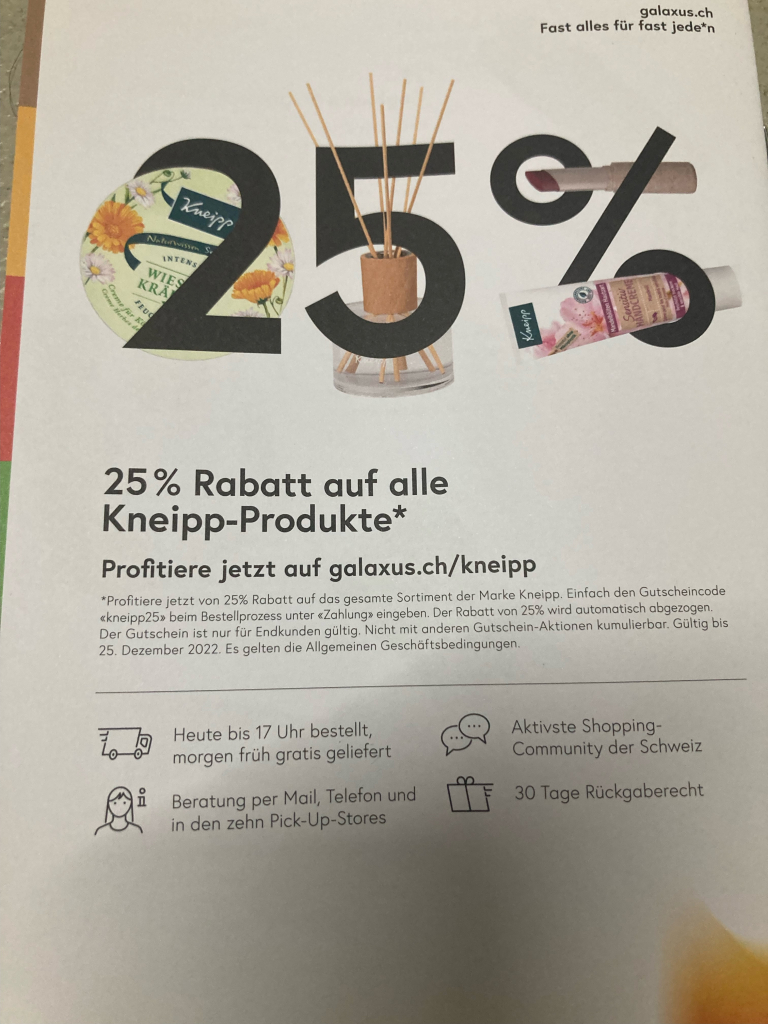 Bei Galaxus bekommt ihr 25% Rabatt auf das gesamte Kneipp Sortiment mit dem Gutscheincode „kneipp25“.