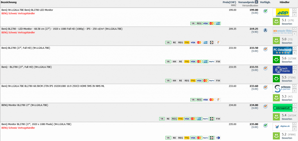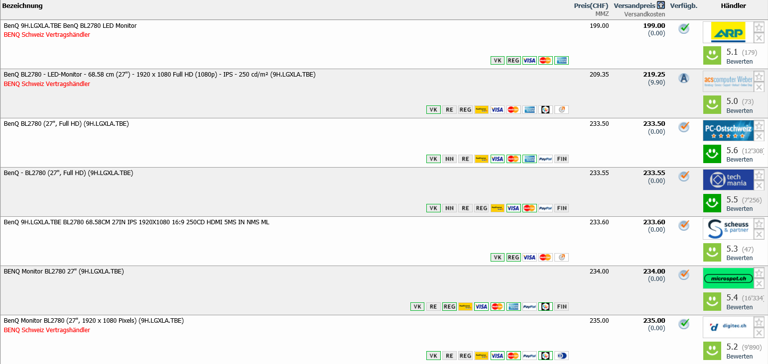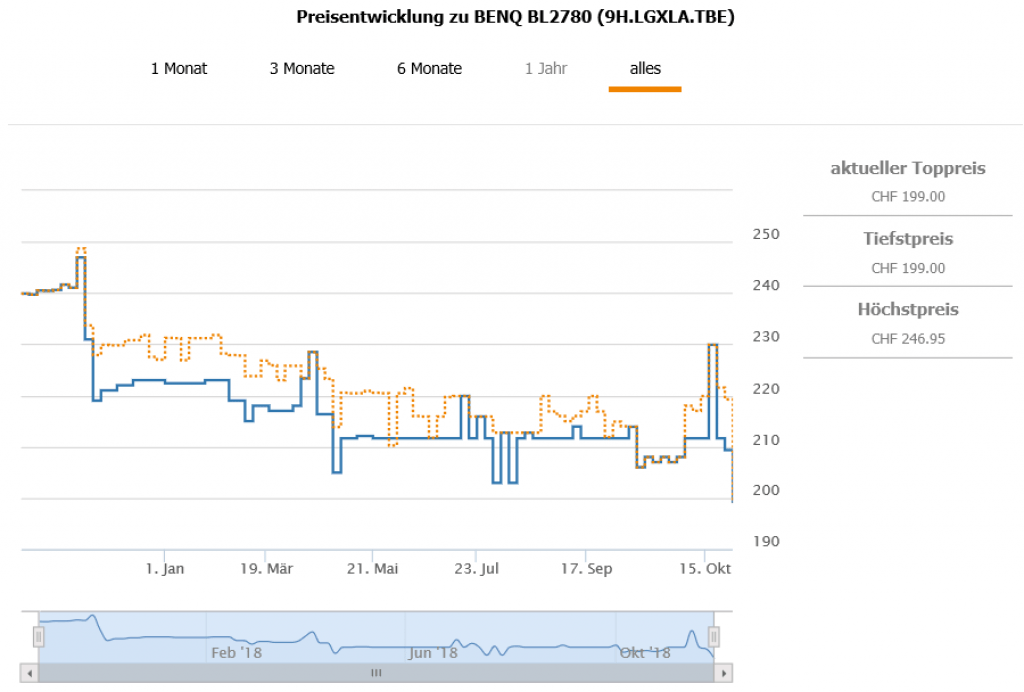 Gemäss toppreise gab es den Monitor bislang nie günstiger als für 206.- CHF, der zweitbeste Preis liegt aktuell bei 219.25 CHF.