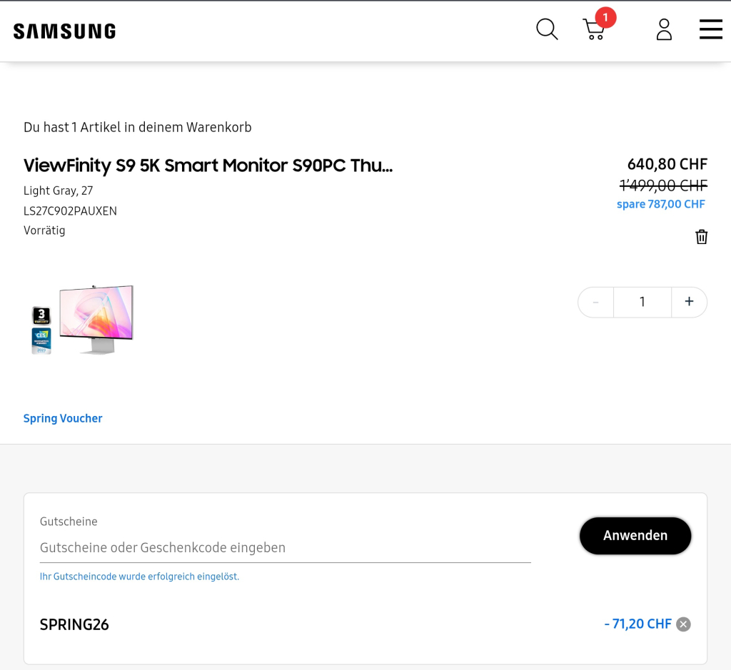 Aktuell gibts den 27″ Viewfinity S9 5K Smart Monitor zum Preis vonCHF 640.80. Auf diesen Preis kommt ihr, wenn ihr den Voucher Code im Warenkorb eingebt. Gemäss der Webseite ist der Code quch auf andere Produkte anwendbar – ausser das neue Galaxy S26 und Memory Produkte. Bis zu einem Einkauf von CHF 399 ist dies 5% zusätzlicher Rabatt, ab CHF 400 10%.
