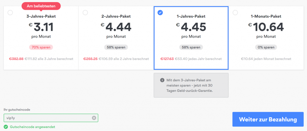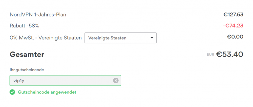 Das NordVPN 1-Jahres-Abonnement kostet normalerweise €6.22 pro Monat, doch mit dem Code vip1y wird der Preis auf 28% reduziert. Gesamtpreis beträgt dann €53.40 (statt €74.65).