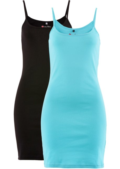 Dieses ansprechende Set besteht aus zwei verschiedenfarbigen Modellen. Die figurbetonenden Kleider im Zweierpack sind attraktive Basics für viele Kombinationen. An heissen Tagen sorgen sie mit einer luftigen Bluse für ein sommerliches Outfit. Wenn es kühler wird, tragen Sie es mit einer Strickjacke. Die Kleider aus der bpc Kollektion mit Spaghettiträgern und Rundhalsausschnitt eignen sich zudem als Unterkleid für Häkelkleider und andere halbtransparente Modelle.