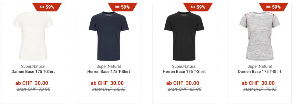Damit erhält man beispielsweise 2x T-Shirts aus Merino-Wolle für 55 Franken d.h. weniger als 30 Franken pro T-Shirt.
