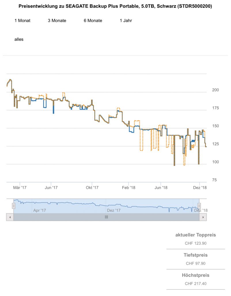 Gemäss toppreise war der bestprice für eine Festplatte bislang bei 97.90 CHF, der zweitbeste Preis aktuell liegt bei 123.90 CHF für eine Festplatte.