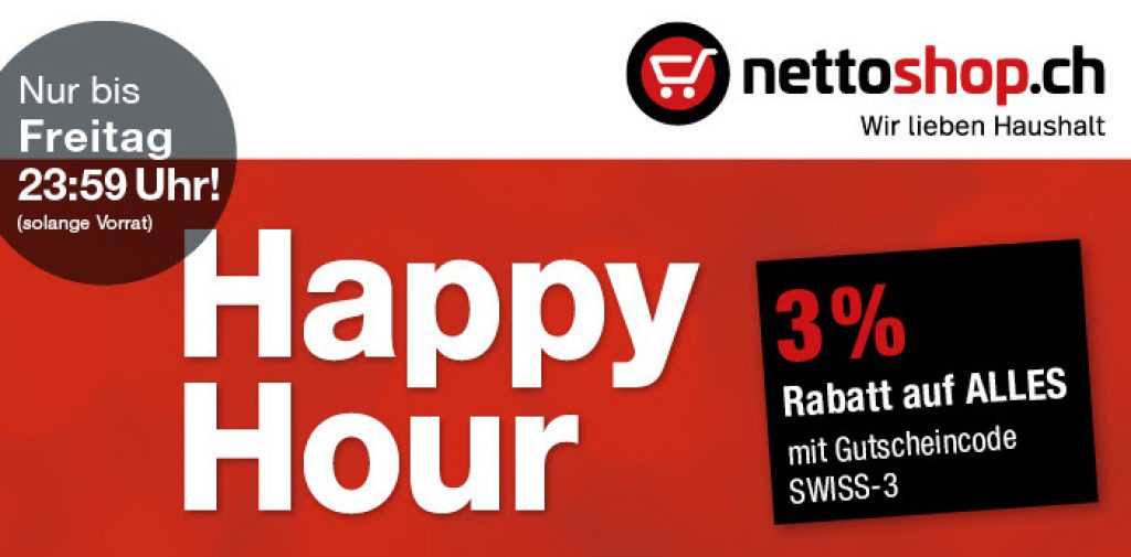 Bei nettoshop gibt’s noch bis und mit Freitag 3% Rabatt aufs gesamte Sortiment. Der Gutscheincode dazu lautet: SWISS-3
