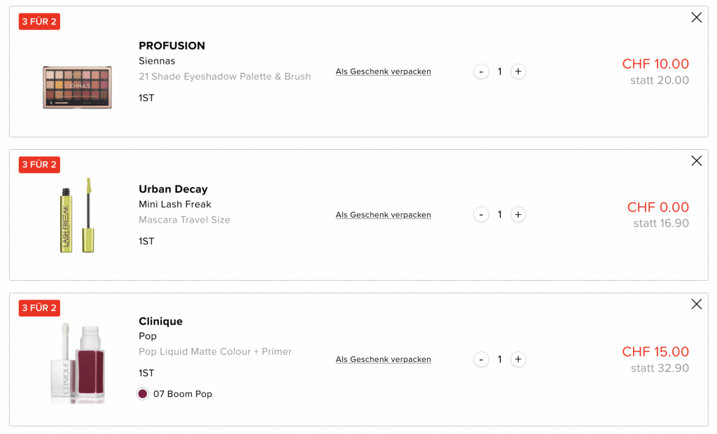 So erhält man beispielsweise eine Profusion Lidschattenpalette, eine Urban Decay Mascara und einen Clinique Lippenstift für CHF 25.- inklusive Versand (anstatt CHF 35.-).