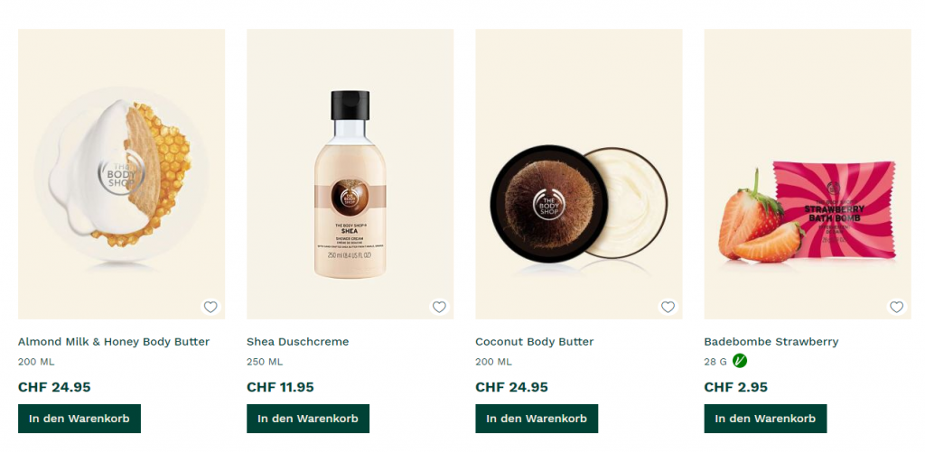 Linien: Coconut, Strawberry, Mango, Moringa, Shea, Olive, Pink Grapefruit, Wild Argan, British Rose, Almond Milk & Honey, Fuji Green Tea. Exklusive Geschenke und Sale Artikel.