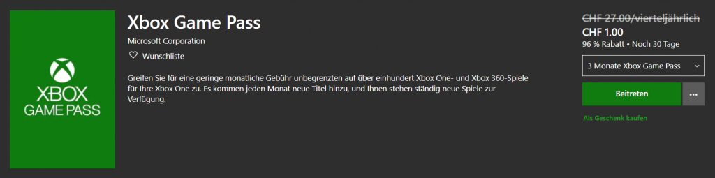 Für Neukunden und ehemalige Kunden (nicht für Bestandeskunden) gibt’s den 3-Monate Xbox Game Pass im Microsoft Store im Moment für 1 Franken zu kaufen. Wie lange das Angebot genau noch gilt, steht leider nirgends.