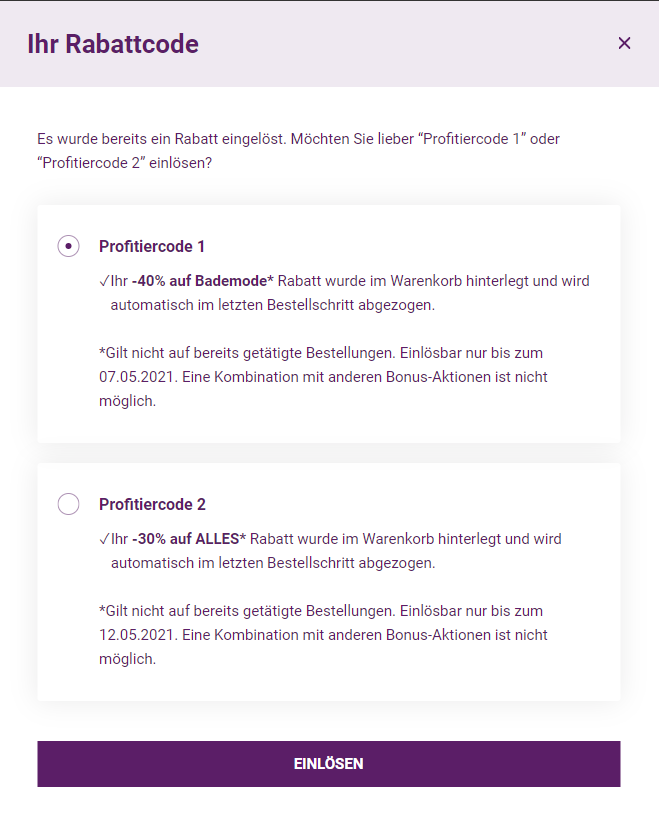 1. Ihr -40% auf Bademode* Rabatt wurde im Warenkorb hinterlegt und wird automatisch im letzten Bestellschritt abgezogen.