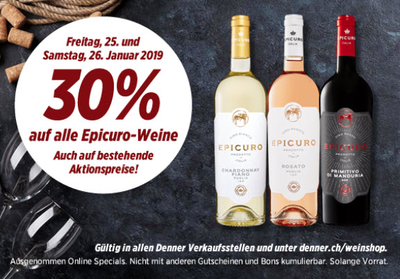 Am Freitag und Samstag gibt es bei Denner in der Filiale oder im Onlineshop 30% Rabatt auf alle Epicuro Weine. Speziell der Epicuro Primitivo di Manduria DOP (CHF 6.95 / Flasche) ist zu erwähnen, welcher ebenfalls von der Denner Community mit grossem Abstand zum Wein des Jahres 2018 gewählt wurde. Hier erhält man zu einem interessanten Preis- / Verhältnis einen wirklich guten Tropfen und kann den Keller bei dieser Aktion wieder mal nachfüllen.