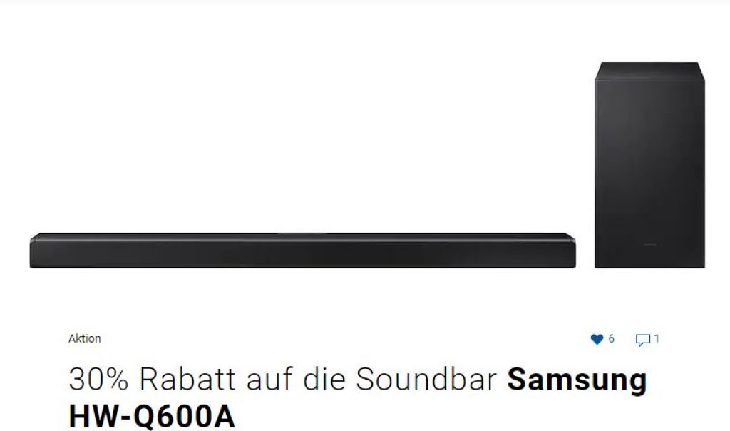 Bei Digitec gibt es aktuell 30% Rabatt auf eine Samsung HW-Q600A, beim gleichzeitigen Kauf eines Samsung QLED oder Neo QLED TV’s.