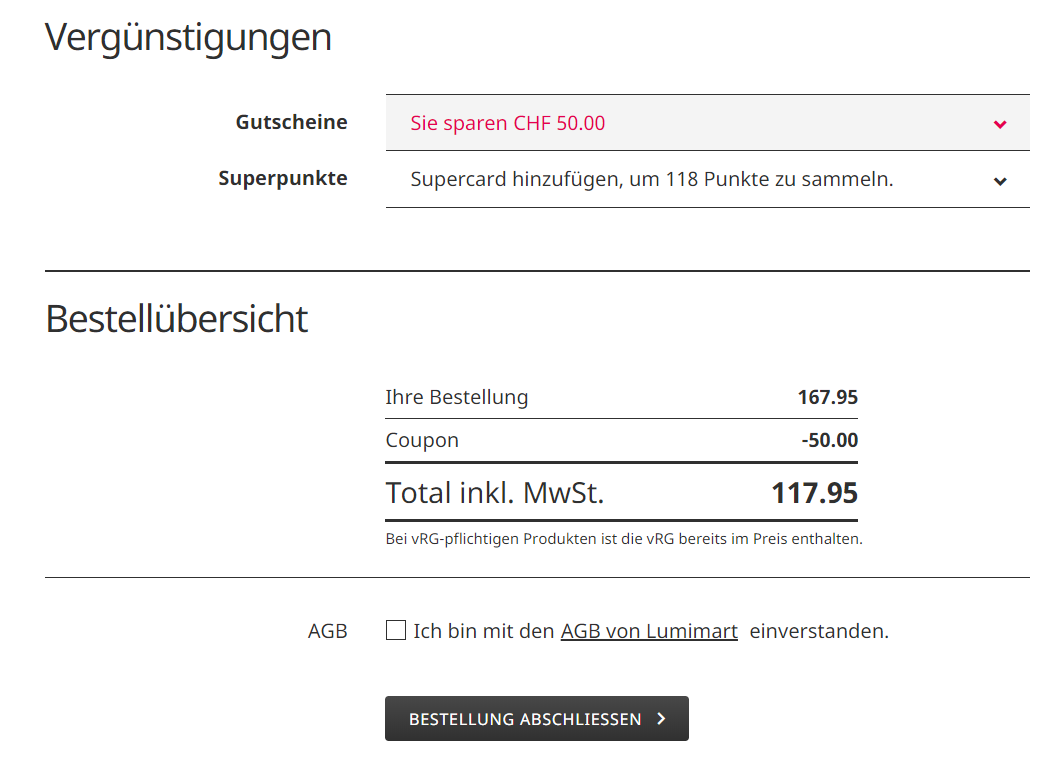 bei mir klappts mit den 50 Franken und den reduzierten hues