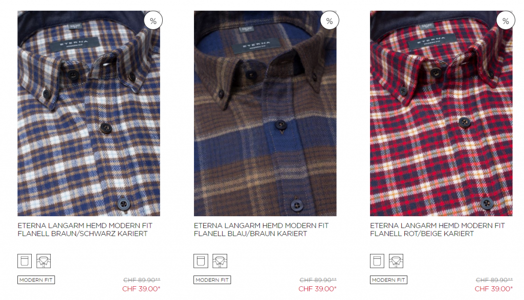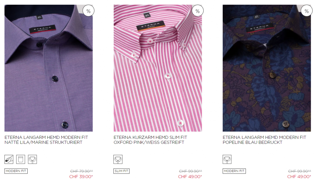 Sehr interessantes Angebot beim Business-Mode Anbieter Eterna. Auf reduzierte Artikel gibt’s 30.- Rabatt, wenn man für mindestens 79 Franken bestellt. Der Gutscheincode lautet: EXS4L3CH