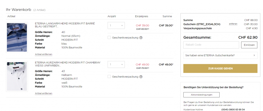 Leider kommt auf die Bestellung noch CHF 4.90 Verpackungspauschale obendrauf. Im Idealfall bestellt man ein Hemd für 39 Franken und ein Hemd für 49 Franken. So kommt man auf ca. 30 Franken pro qualitativ hochwertigem Hemd. Mit zwei Hemden für 39 Franken erreicht man den MBW für den Gutscheincode leider knapp nicht.