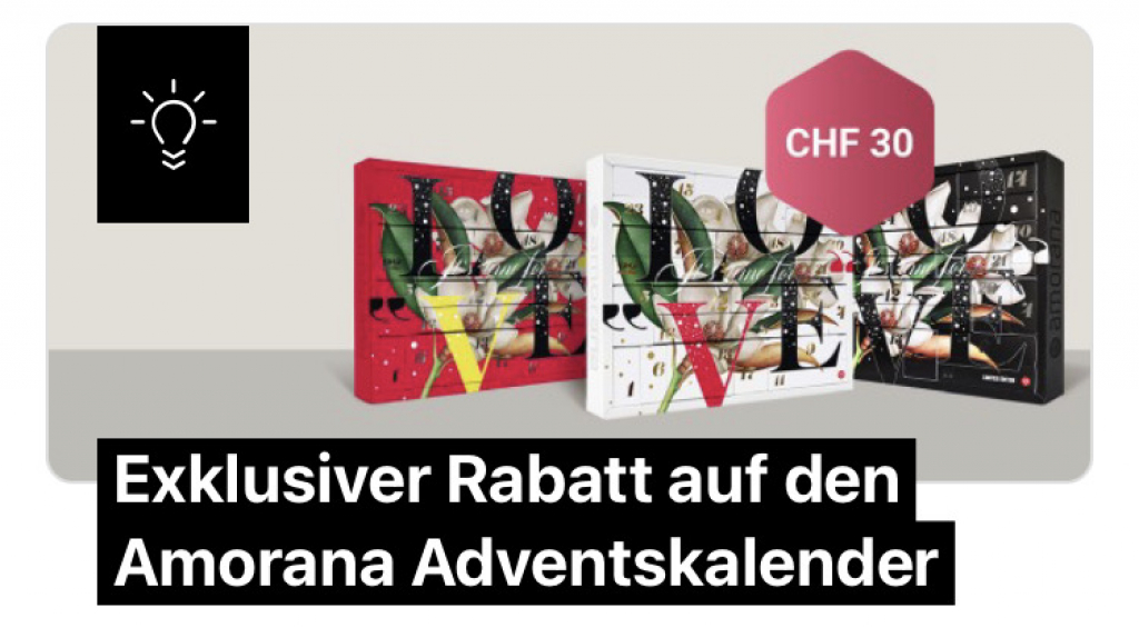 Anstelle eines Schokokalenders lieber etwas Aufregenderes dieses Jahr? Wenn du einen der beliebten Amorana Adventskalender mit TWINT bezahlst, profitierst du automatisch von einem Rabatt von CHF 30 bei Amorana.