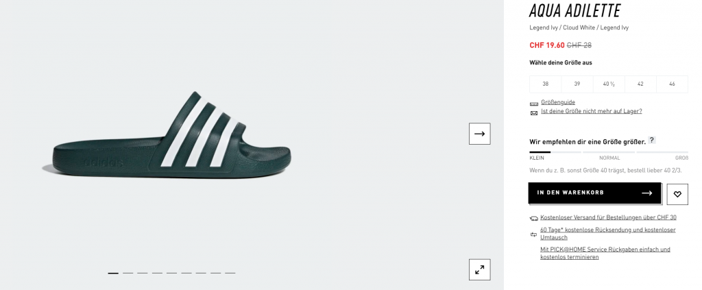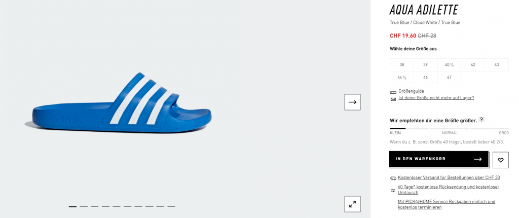 Einige Aqua Adiletten sind auch im Preis reduziert und in verschiedenen Grössen verfügbar (die 30% werden zusätzlich abgezogen, die Lieferung ist aber erst ab einem Bestellwert von CHF 30.- gratis):