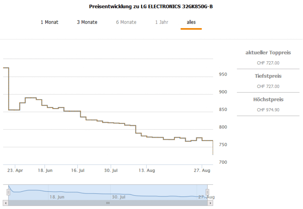 Gemäss toppreise gab es den Monitor bislang nie günstiger als für 766.- CHF, der zweitbeste Preis liegt aktuell bei 769.90 CHF.