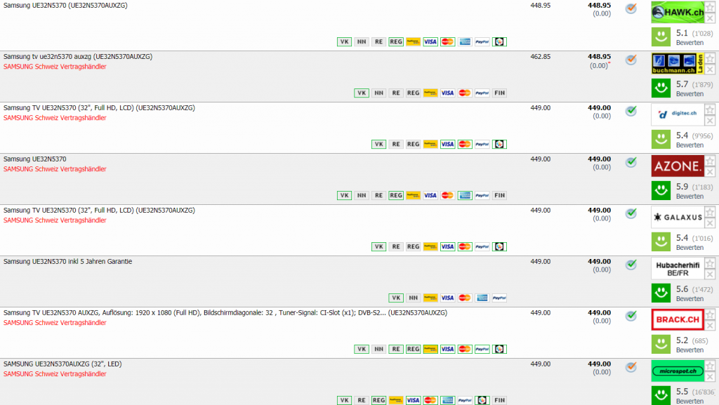 Bei DayDeal gibt’s heute den 32-Zoll Fernseher Samsung UE32N5370 für CHF 299.- Bisheriger Bestpreis war CHF 399.- Zweitbester Preis im Moment liegt bei CHF 449.-