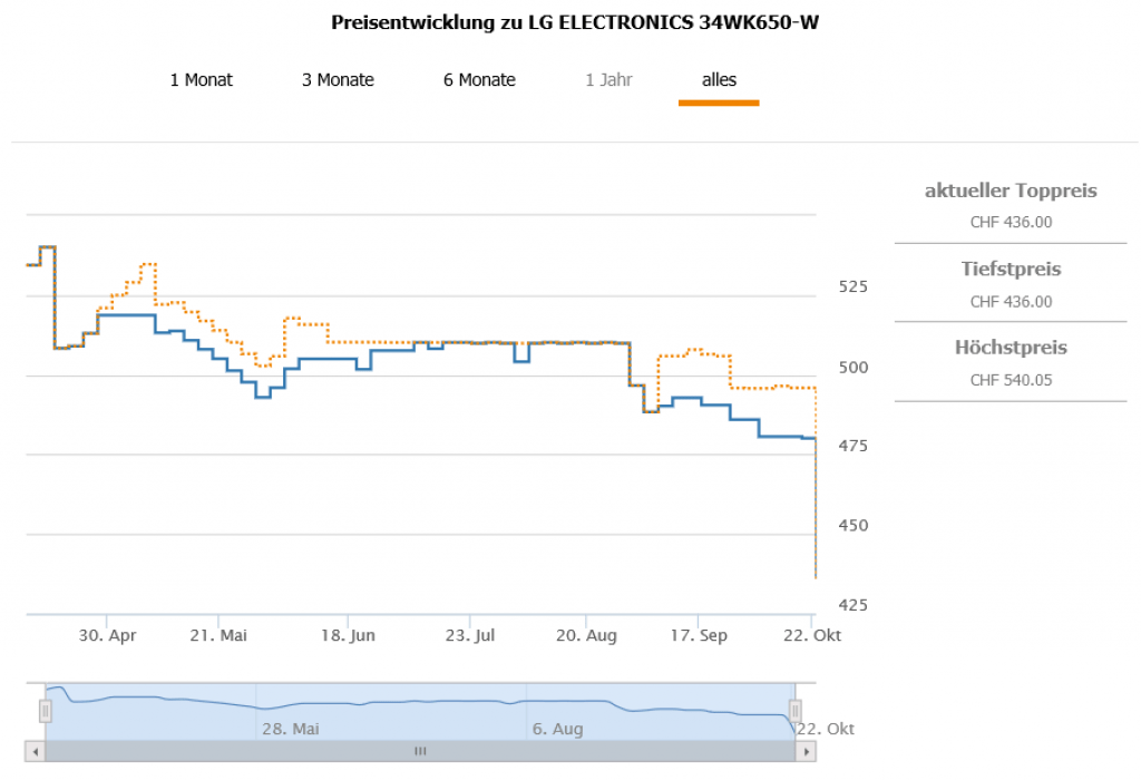 Gemäss toppreise gab es den Monitor bislang nie günstiger als für 488.35 CHF, der zweitbeste Preis liegt aktuell bei 495.90 CHF.