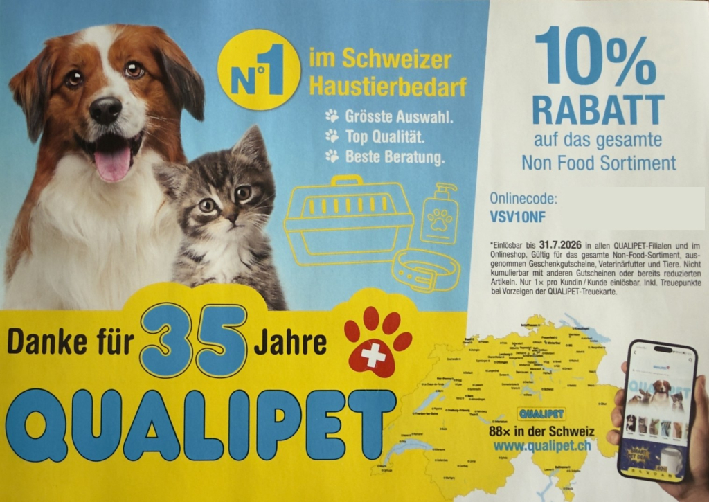 Bis zum 31.7.2026 einlösbar in allen QUALIPET-Filialen und auch im Onlineshop. Er ist gültig für das gesamte Non-Food-Sortiment, ausgenommen sind…