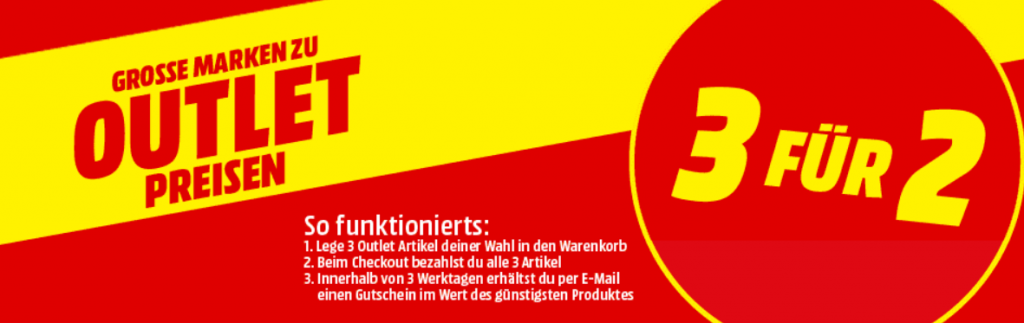 Bei Mediamarkt gibts zurzeit eine interessante Aktion. So gibts wenn man 3 Outlet-Artikel einkauft nach 3 Tagen einen Gutschein in Höhe des Wertes des günstigsten Artikels per Email zugestellt.