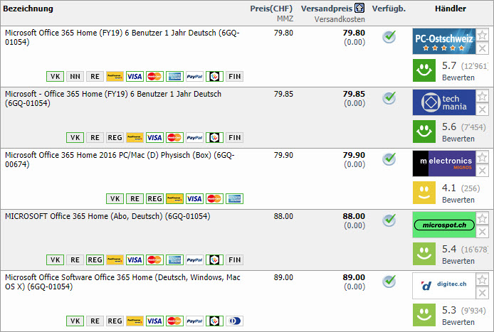 Aktuell gibt es bei digitec wieder mal (auf 500 Stück begrenzt) das Bundle mit 3 x Microsoft Office 365 Home und 3 x Norton Security Deluxe für CHF 189.-. Das gleiche Angebot gab es vor rund 3 Monaten schon mal etwas günstiger - der Preis ist aber nach wie vor nicht schlecht, wenn man Norton Security Deluxe einsetzen möchte. Ansonsten heisst es, warten bis Office 365 alleine wieder mal für rund CHF 50.- im Angebot ist.