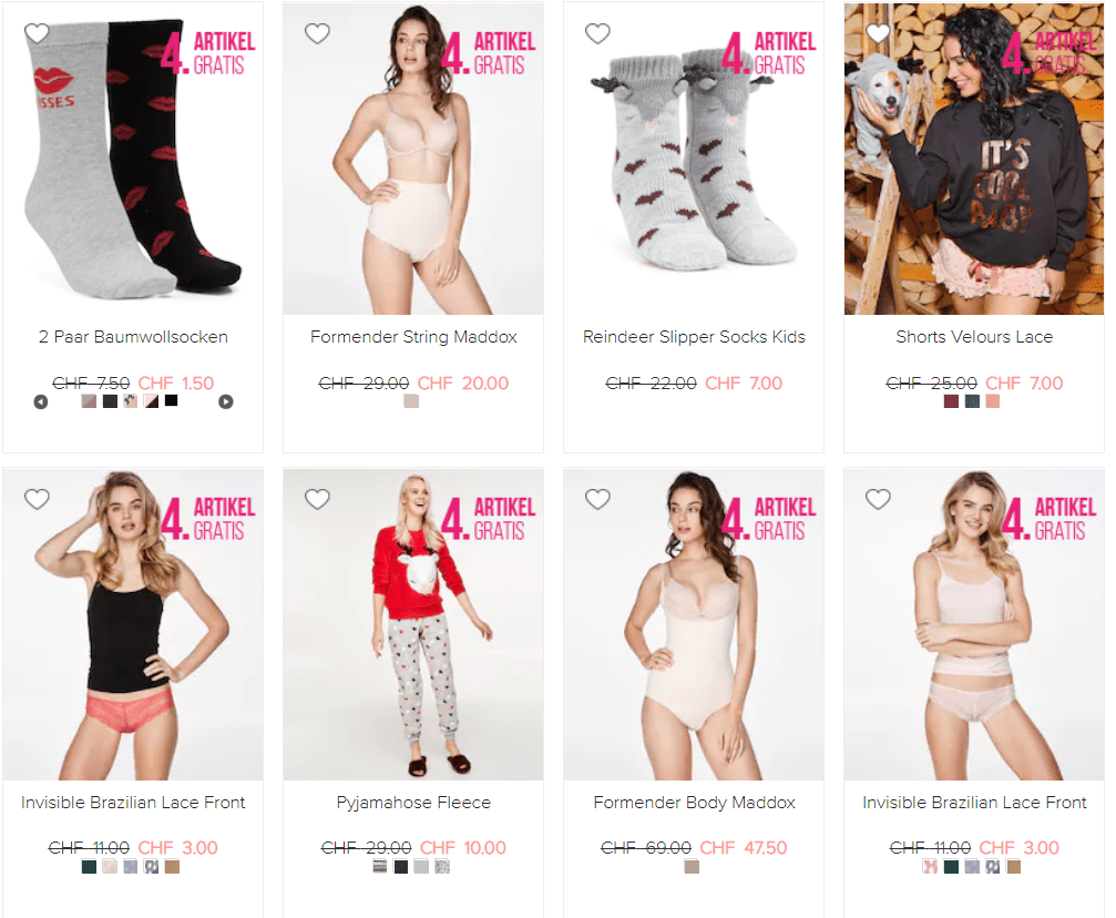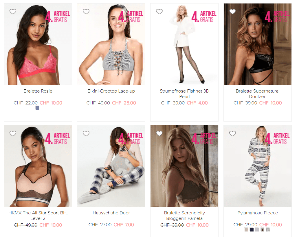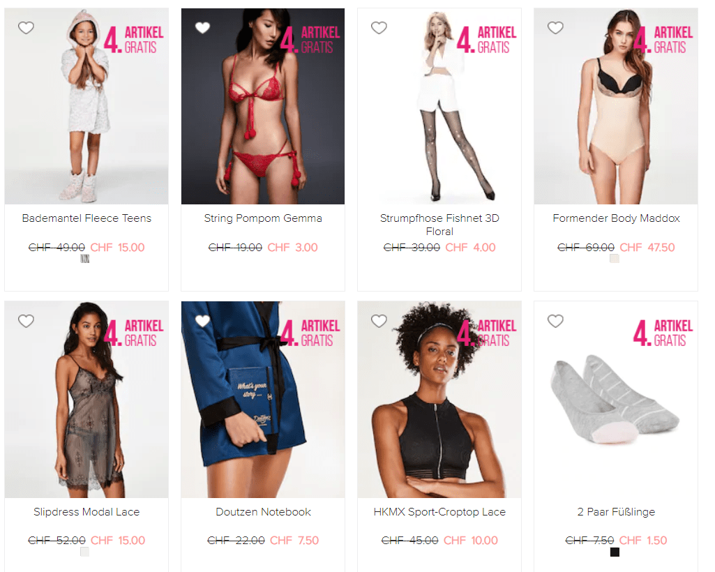 Bei Hunkemöller gibt’s mit dem Gutscheincode 4THFORFREE den vierten Artikel gratis. Die Aktion gilt auf reguläre Ware sowie auch auf alles aus dem SALE, das bereits stark reduziert ist. Natürlich wird der günstigste Artikel gratis gegeben.