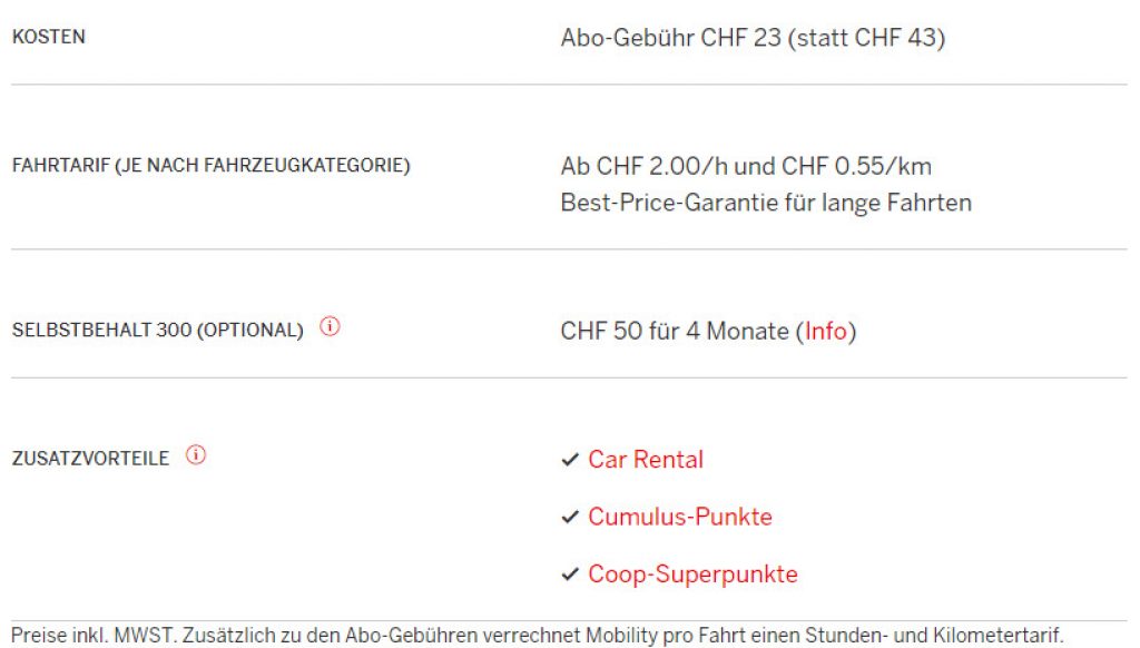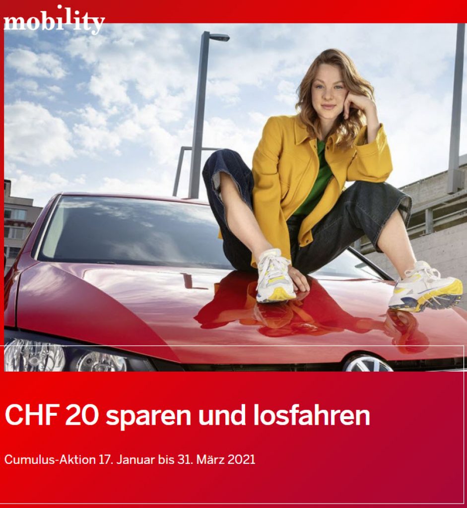 “Dank deiner Cumulus-Karte kannst du Mobility vier Monate lang für eine Gebühr von CHF 23 (statt CHF 43) testen. Das ist aber noch nicht alles: Sammle mit Mobility Cumulus-Punkte! Für jeden Umsatzfranken aus Zeit- und/oder Kilometerkosten gibt es einen Cumulus-Punkt.”