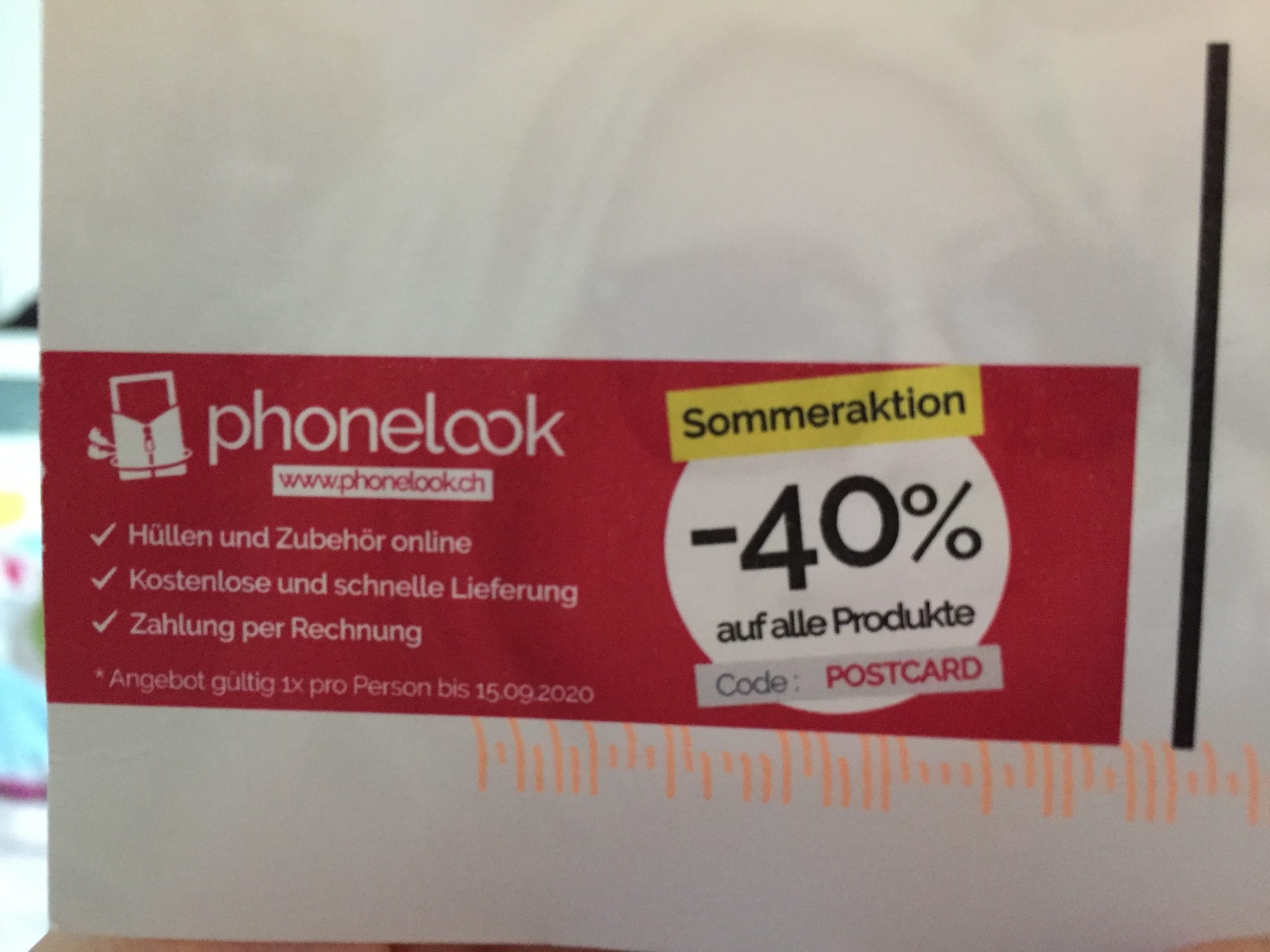Bei Phonelook erhält man mit dem Code POSTCARD 40% auf das gesamte Sortiment. Der Code ist bis zum 15.09. gültig und kann pro Account nur 1x verwendet werden. Bei Phonelook gibt es Hüllen und Zubehör für Handys. Danke an Zeljko für den Deal!:)