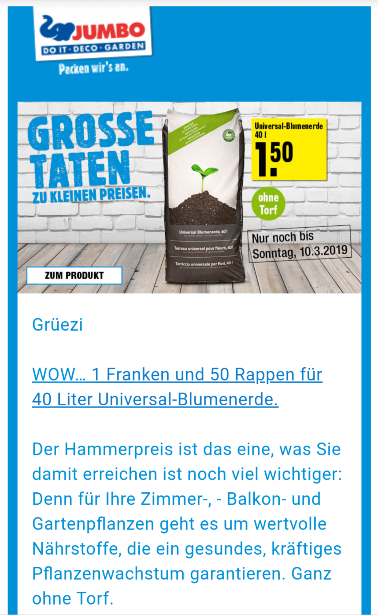 Letztes Jahr waren es noch 1.00 pro Sack (https://www.preispirat.ch/40-l-blumenerde-bei-jumbo-gartenmarkt-fuer-1-chf/), aber damals war die Erde auch noch nicht torffrei und im Normalpreis deutlich günstiger.