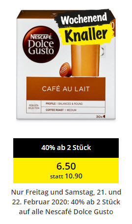 Am Freitag und Samstag (21. / 22.2.2020) gibt es in den Coop Filialen oder online bei coop@home auf das ganze Nescafé Dolce Gusto Kaffeekapselsortiment nach Wahl (exkl. Starbucks) 40% Rabatt (ab 2 Stück).