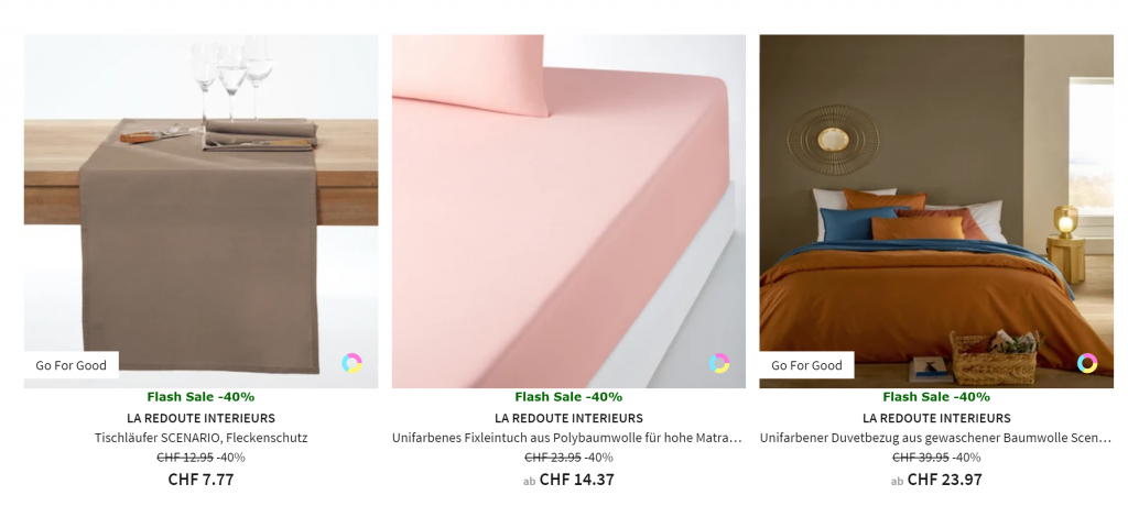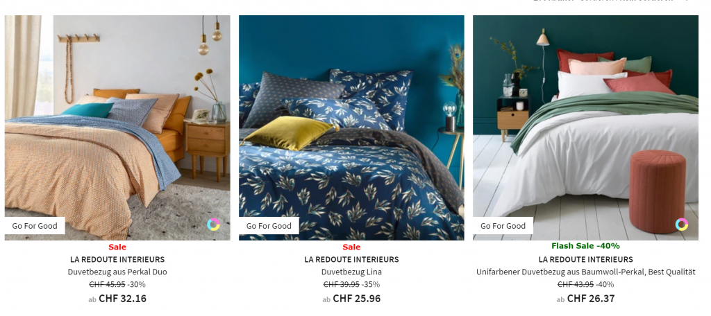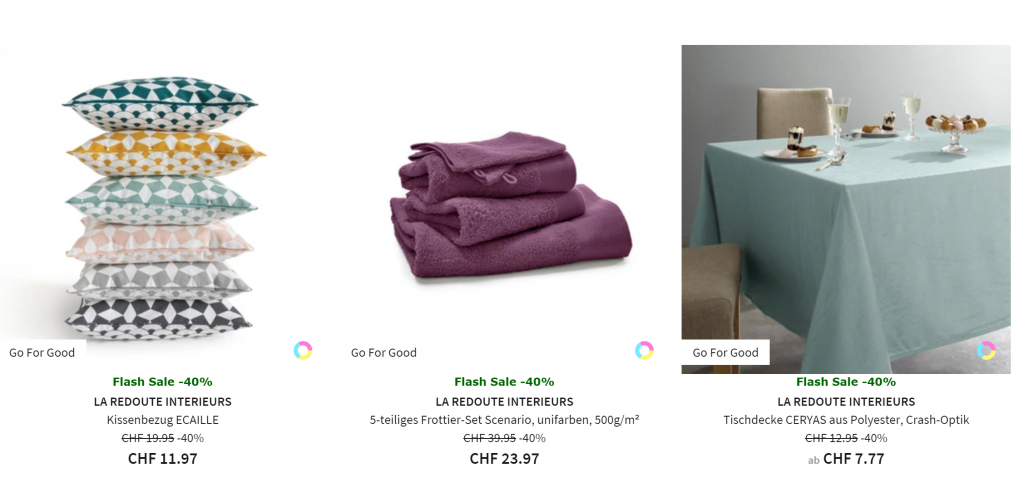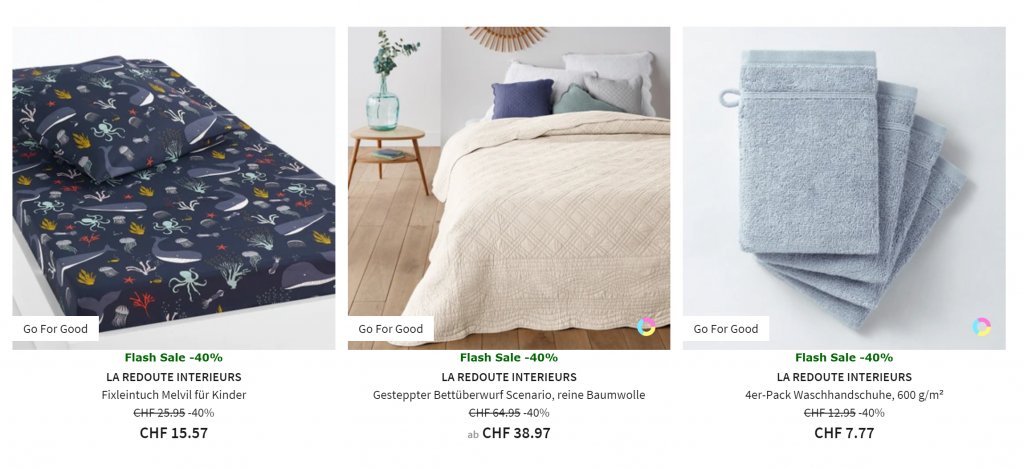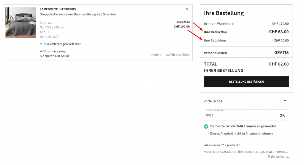 Bei LaRedoute gibt’s bis am Montag 40% Rabatt auf fast alle Heimtextilien. Zusätzlich kann man den Gutscheincode SMILE einsetzen, der einen Rabatt von 20.- ab einem Mindestbestellwert von 100.- gibt. Dieser gilt nur für Neukunden, sprich ein neues Kundenkonto erstellen. Das Angebot gilt bis am Montag.