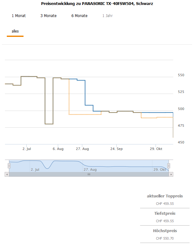 Gemäss toppreise gab es den TV bislang nie günstiger als für 479.90 CHF, der zweitbeste Preis liegt aktuell bei 489.95 CHF.