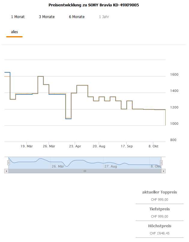 Den TV gab es gemäss toppreise bislang nie günstiger als 1089.55 CHF, der zweitbeste Preis liegt aktuell bei 1191.85 CHF.