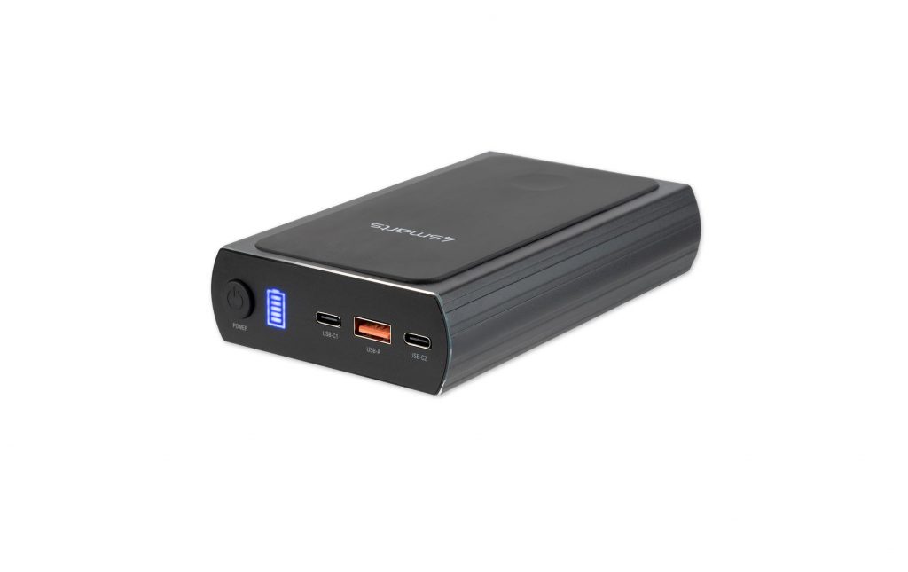 - 3 USB-Ladeanschlüsse: 1x USB-C PowerDelivery (bis 100 W in/out), 1x USB-C PowerDelivery (bis 60 W in/out), 1x USB-A QuickCharge 3.0 (bis 22,5 W)