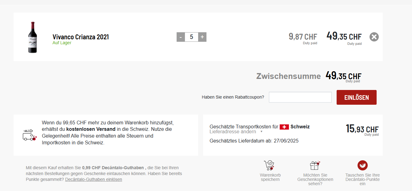 Aktuell gibt es bei SCHULER St. Jakobs Kellerei den Vivanco Crianza Rioja DOC 2021 Rotwein in Aktion mit spanischer Herkunft. Und zwar bekommt ihr 5 Flaschen von diesem Wein für einen Preis von 49.30 Franken mit Lieferung dazu berechnet.