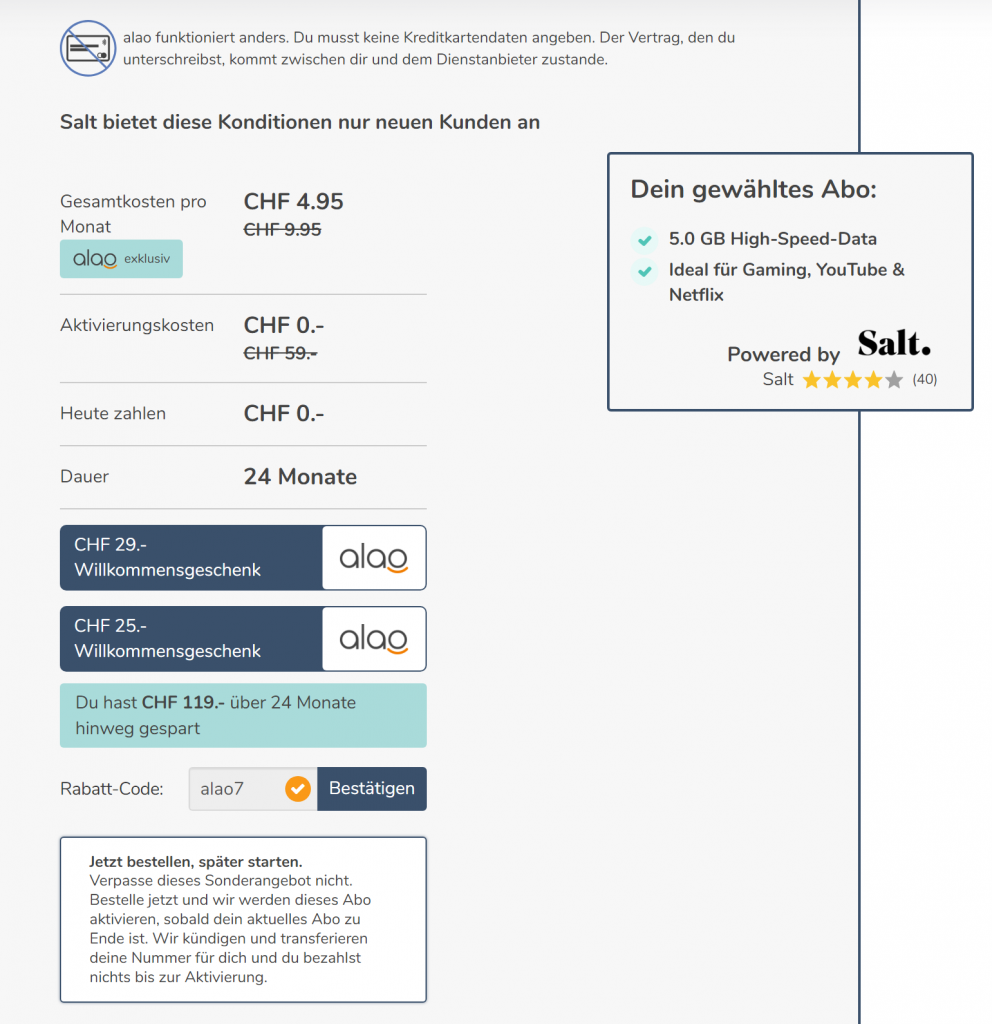 Bei alao gibt’s gerade ein salt Abo mit 5gb Daten für 4.95 CHF. Eigene SIM-Karte. Mit dem Code alao7 gibt’s nochmals 25.- CHF als Willkommensgeschenk. Zudem ist derzeit ein Willkommengeschenk von 29 Franken direkt auf der Landingpage hinterlegt, das mit dem Gutscheincode kombinierbar ist. Keine Aktivierungsgebühr.