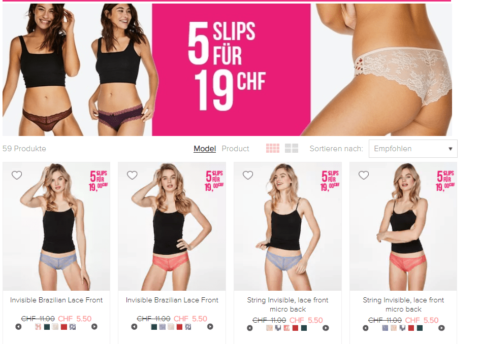 Bei Hunkemöller erhält man wieder einmal günstig Slips nach Wahl. Für 19.- gibt’s 5 Slips (also knapp 4 Franken pro Slip). Bestellt man noch etwas für einen Franken beispielsweise aus dem SALE, erhält man auch noch Gratisversand.