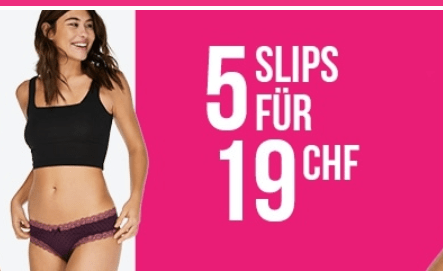 Bei Hunkemöller erhält man wieder einmal günstig Slips nach Wahl. Für 19.- gibt’s 5 Slips (also knapp 4 Franken pro Slip). Bestellt man noch etwas für einen Franken beispielsweise aus dem SALE, erhält man auch noch Gratisversand.