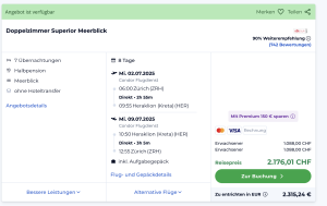 Der Preis oben ist ohne Flug. Mit Flug kostet es bei TUI mindestens CHF 2'522.- inkl. Frühstück. Bei Holidaycheck gibts die genau gleiche Reise bereits für CHF 2'176.- mit Halbpension und Meerblick. Alles für 2 Pers.
