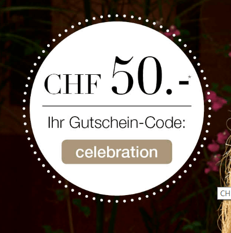 Mit dem Code celebration gibt’s 50.- Rabatt ab einem Mindestbestellwert von CHF 150.- Gültig bis und mit Montag, 11. März.