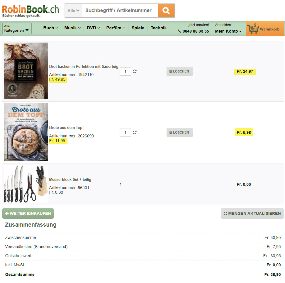 Über diesen speziellen Link gibt es 50% Rabatt auf alle Bücher. Der Rabatt wird euch aber erst im Warenkorb angezeigt. Ab einem Warenwert von CHF 30.- erhaltet ihr im Warenkorb automatisch noch ein kostenloses 7-teiliges Messerblock Set dazu.
