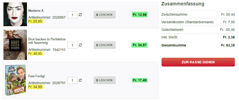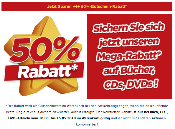 Bis zum 15.5.2019 gibt es bei Robinbook.ch auf alle Bücher, CDs, DVDs und Blu-Rays 50% Rabatt. Es wird kein Gutscheincode benötigt und der Rabatt wird direkt im Warenkorb abgezogen (falls es nicht klappt, einfach mit einem anderen Browser und / oder Gerät nochmals probieren). Zu beachten ist, dass bei einer Bestellung noch Portokosten von CHF 7.95 anfallen.